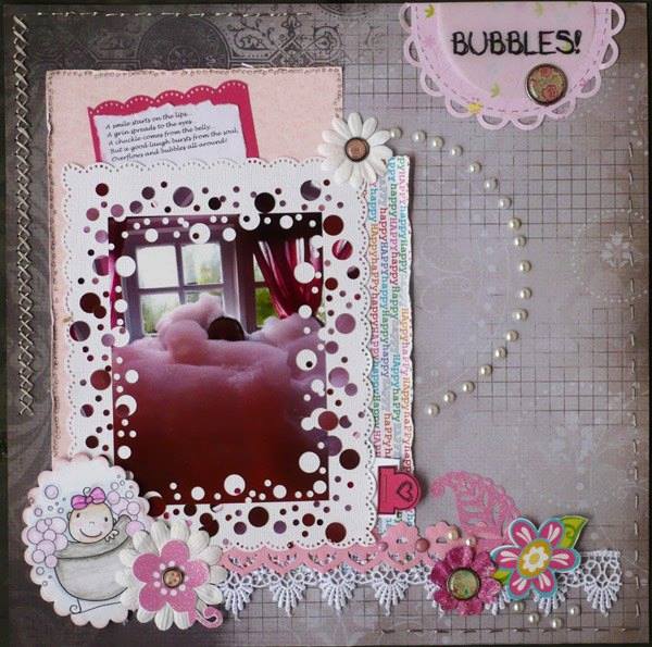 Usei o mesmo layout da página dela, misturando papeis e enfeites dos dois últimos Kiss, o Ticket to Ride e o Girl Power. E usei ali embaixo, um canudo de papel com umas bolinhas, pra fazer referencia às bolhas do LO da Débora.